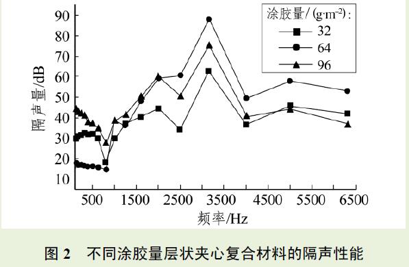 圖2所示3條曲線為固定熱壓時間5min、壓力3MPa,涂膠量分別為32、64、94g/m2時,復合材料的隔聲性能測試結果。