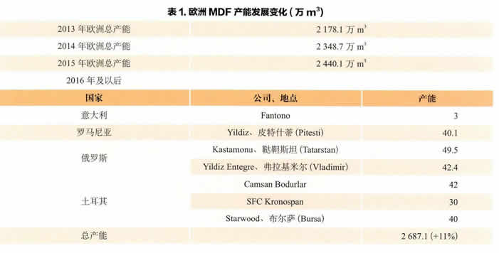 從2014年的市場顯示,總裝機(jī)容量2348.7萬m3,然后2015年已經(jīng)安裝完成生產(chǎn)線的調(diào)整和修正微調(diào)信息,達(dá)到2440.1萬m3。根據(jù)表1中列出的將來的工廠產(chǎn)能,我們現(xiàn)在的預(yù)測數(shù)字為2687.1萬m3,作為歐洲大陸2016-2017年的總產(chǎn)能。