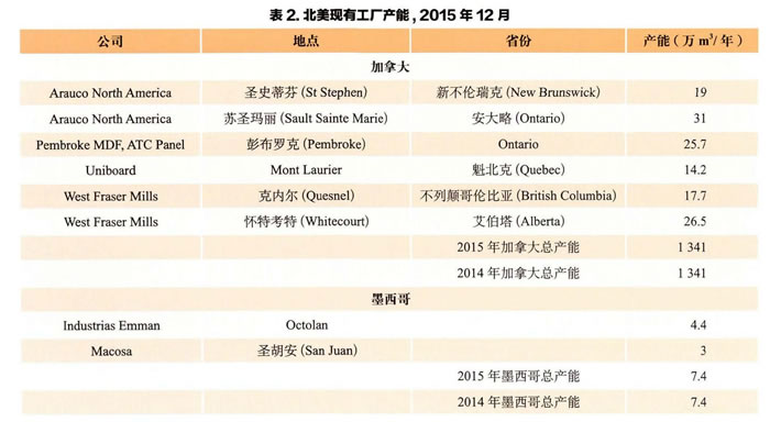 在加拿大,密度板業(yè)務(wù)保持穩(wěn)定,去年市場保持溫順改善,較積很的消息是,在安大略彭布羅克(Pembroke,Ontario)重新設(shè)立的ATC工廠現(xiàn)在已經(jīng)完全投人運營。在墨西哥,產(chǎn)能發(fā)展都在建設(shè)階段,進(jìn)展順利,這些情況將在后面更詳細(xì)地報告。截至2015年底兩個地區(qū)產(chǎn)能清單還顯示了2016年,2017年及以后的預(yù)期產(chǎn)能的變化。
