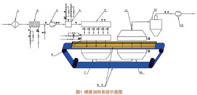 在進風風機(3)的作用下,凈化的冷空氣(1)經 過空氣-熱油加熱器(2)在混合室(4)中與蒸汽混合, 達到工藝要求的混合溫度和濕度后,混合氣體透過網帶 和帶孔壓板進入板坯。為防止產生冷凝水,帶孔壓板采 用熱油盤管(6)進行加熱。