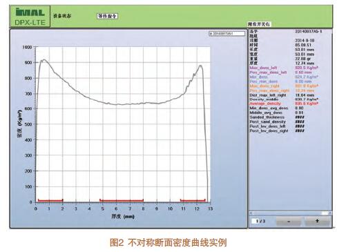 如圖2所示,斷面密度曲線(VDP)峰值左側920 kg/m3,右側880 kg/m3, 相差40 kg/m3;同時左側致密層厚約5~6 mm,而右側厚約3~4 mm,這在生 產12 mm中密度板時并不常見。因此在生產中將峰值高度、致密層厚度 明顯差異的斷面密度曲線稱為不對稱曲線。