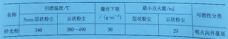 (4)砂光粉的爆炸性。粉塵爆炸是指在空氣中懸浮的粉塵急劇地氧化燃燒,同時產生大量的熱和高壓的現象。粉塵的粒徑越小,其表面積越大,如邊長為1mm的立方體粉塵粉碎成邊長為O.1mm的立方體后,其表面積由6mm2劇增至60mm2。由于表面積的增加,增大了與周圍介質的接觸面積,使其活潑性大為增加,在一定的溫度和濃度下就會引起爆炸,特別是遇有明火或機械摩擦與電器設備等發生的火花時均可能引起爆炸。砂光粉易燃易爆危險性參數,如表7-3所示。