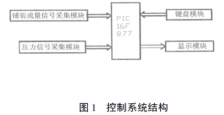 本系統(tǒng)在生產(chǎn)線上完成對(duì)密度板原料重量的檢測(cè)后,將其數(shù)據(jù)轉(zhuǎn)換成板材的密度值并顯示、回饋給鋪裝設(shè)備的操作人員,進(jìn)行鋪裝厚度的調(diào)整,同時(shí)對(duì)調(diào)整的量進(jìn)行記錄和顯示,以便于下次調(diào)整。整個(gè)控制系統(tǒng)分為鋪裝流量信號(hào)采集模塊、壓力信號(hào)采集模塊、鍵盤模塊和顯示模塊4個(gè)部分。