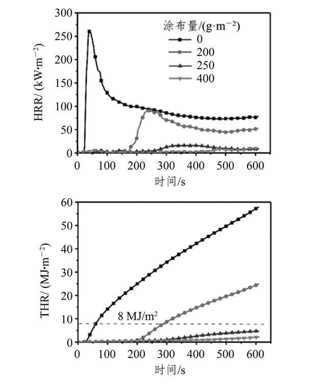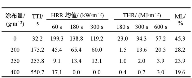 觀察炭質層膨脹狀態發現, 涂布量為200 g/m時, 雖有膨脹層形成, 但膨脹高度不足以抵擋外界熱源的作用, 170 s之后膨脹層裂開并從開裂處被引燃, 火勢逐漸壯大;當涂布量增加到250 g/m時, 形成的膨脹層較高, 隔熱能力提高, 250 s時才從膨脹層開裂處引燃, 且火勢較小;當涂布量繼續增到400 g/m時, 膨脹層高度大幅度提高, 隔熱隔氧能力也提升, 表現為引燃時間近10 min, 且10 min內的釋熱總量降低到3.0 MJ/m, 質量損失不足20%。