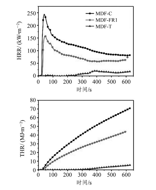 表4中還列出各試樣受熱600s內的質量損失率 (ML) 和各時間段內的釋熱總量 (THR) , 均以MDF-T較低, MDF-FR1次之, MDF-C較高。由此說明, 雖然阻燃氨基樹脂只存在于MDF表面, 但其形成的膨脹炭質層有效地抑制了木材的熱分解, 減少質量損失, 降低燃燒釋放的熱量, 而且時間越長效果越明顯。這種作用效果是阻燃氨基樹脂作用機理與表面涂布方式有機結合的結果, 對抑制火勢擴大和火災的蔓延速度具有重要作用。