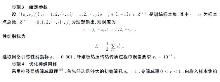 文獻 研究了非線性熱傳導方程中未知系數的反演問題,采用中心差分離散方程得到迭代矩陣,通過建立牛頓迭代格式求解迭代增量,反演出方程中未知系數。文獻運用分離變量法、齊次化原理、定義算子的方法,求解了微波加熱過程中木材內部溫度的熱傳導模型中熱源的近似解析解。本文利用多輸入單隱層神經網絡逼近多項式方法及文獻的理論,參考中密度纖維板熱壓干燥過程中的溫度及濕度傳遞規律,結合中密度纖維板的構造特點以及與纖維板傳熱相關的物理性質,通過訓練已有的實驗數據,利用單隱層前向神經網絡對纖維板熱壓過程中木材內部溫度、濕度以及含水率之間的函數關系進行參數識別,該模型能夠直觀地反映纖維板熱壓干燥過程中相對濕度與熱壓溫度及含水率之間的函數關系,實現對板坯含水率的定量分析,因此對纖維板干燥過程中的質量控制有一定的指導作用;在分析纖維板熱壓過程中纖維板內部傳熱傳質規律的基礎上,建立相關的熱濕模型,從定量的角度去分析問題,為實際應用提供數值化直觀數學模型。