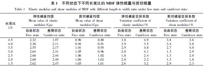 在自由狀態時,將5 塊MDF 依不同長寬比進行截短,測試出的MDF 彈性模量及剪切模量均值、變 異系數如表1 所示。隨著長寬比的降低,彈性模量及剪切模量呈先上升后下降趨勢。自由狀態時,彈性 模量變異系數為1.8%~ 3.9%; 剪切模量變異系數為1.3% ~ 3.8%。懸臂狀態時,彈性模量變異系數為 2.2%~4.9%; 剪切模量變異系數為1.8%~4.0%,表明在上述兩種狀態測試下,試驗各組測試值分別接近 本組平均值,數值穩定,變異程度小。在自由狀態下彈性模量測試值隨l /b 變化較平坦且大于懸臂狀態 測試值,原因來源于懸臂狀態夾持端不緊固的試驗裝置誤差。