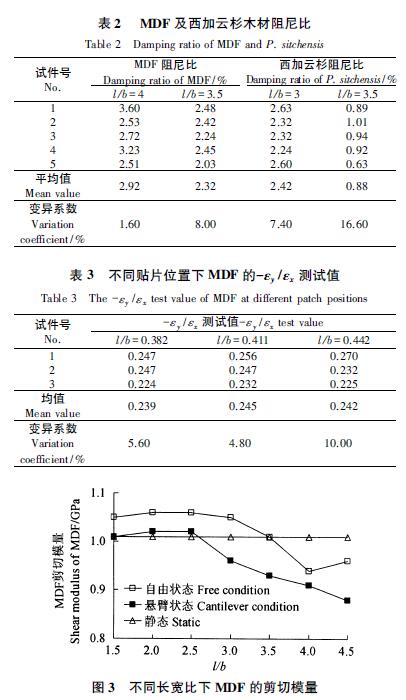 不同長寬比下MDF 與西加云杉的阻尼 比如表2 所示。在不同長寬比下,MDF 阻 尼比均明顯大于西加云杉木材阻尼比。 3.3 MDF 泊松比動態測試與精度 3 塊不同規格的MDF 試件編號分別為 1~3,根據不同貼片位置測試所得的泊松 比如表3 所示。動態測試泊松比的貼片位 置l /b = 0. 411( 這時的-εy /εx 才等于泊松 比) ,在其0.06l 范圍內,測試的-εy /εx 值 與泊松比相對誤差在2.4%以內,故動態測 試的MDF 泊松比具有足夠精度,即可忽略 貼片位置不精確產生的誤差。