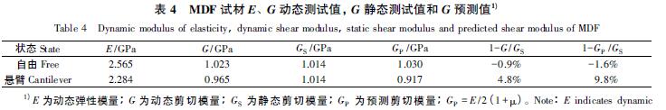據3.3 泊松比動態測試值為0.245,關 于彈性模量和剪切模量取值,從它們在不同 長寬比下測試值取其平均值考慮,在自由約 束狀態E = 2.565 GPa,G = 1.023 GPa; 而懸 臂約束狀態E = 2.284 GPa,G = 0.965 GPa。 方板靜態扭轉試驗測試的MDF 的靜剪切模 量G= 1.014 GPa。從表4 可知,自由狀態動 態測試的彈性模量大于懸臂狀態測試的彈性模量; 自由和懸臂狀態測試的動態剪切模量與靜態測試的剪 切模量相對誤差小于5%; 根據E 和μ 測試值按各向同性材料E、G 和μ 滿足的關系式G =E /2( 1+μ) 計算的剪切模量預測值,其與剪切模量靜態測試值的相對誤差: 對于自由約束狀態不大于2%,而對于懸臂狀 態不大于10%,改善懸臂狀態會減少這種誤差,從而可近似地將MDF 按各向同性材料處理,可稱為準各 向同性材料。