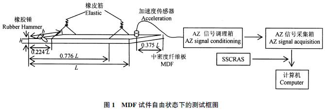 為自由狀態下MDF 的動態彈性模量和剪切模量測試框圖。用牛皮筋懸掛MDF 試件,實現自由 支撐梁方式,加速度計置于距MDF 單側0.375L處; 通過橡皮錘敲擊試件,觸發采集信號,實現兩次敲 擊取平均值,軟件中顯示出頻譜,通過動態信號頻譜分析,識別一彎和一扭頻率,測算得出材料彈性模量及剪切模量,對每塊試件重復測量3次。