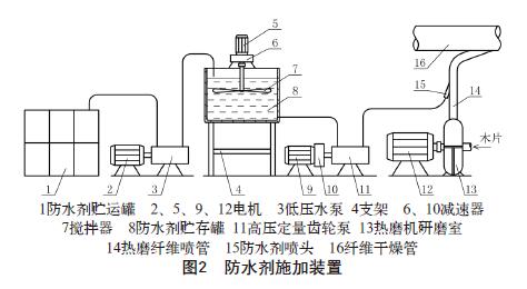 如圖2所示,本防水劑施加裝置首先將貯運罐1中 的防水劑通過水泵3抽注到貯存罐8中,貯存罐內設有 攪拌器7對防水劑進行攪拌,防止防水劑液面結膜。然 后通過高壓定量齒輪泵11將貯存罐8中的防水劑經防水劑噴頭15注入到熱磨纖維噴管14中,在高壓霧化作 用下,使防水劑與纖維在熱磨纖維噴管中混合均勻, 較后進入纖維干燥管16中進行干燥。與其它液體注入 技術相比,本防水劑注入裝置可靠性較高。采用閉環 控制系統,能根據熱磨纖維噴管的實時流量自動調整 高壓定量齒輪泵的轉速,實現按配方比控制納米微膠 囊防水劑的施加量。此外,本防水劑注入裝置結構簡 單,易于制造,維護簡單。