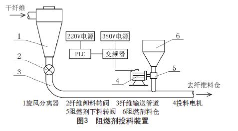 本研究采用的阻燃劑投料裝置如圖3所示。其主 要作用是將阻燃劑粉末按工藝要求精準、定量地投入 纖維輸送管道中,使阻燃劑粉末與纖維均勻混合。該 裝置主要由阻燃劑料倉、投料電機、阻燃劑下料轉閥、 變頻調速器等組成。為了使阻燃劑投放時能根據工藝要求定量可調,本阻燃劑投料裝置采用變頻調速器對 投料電機進行轉速調節,并可通過中控室工業PLC進 行控制。