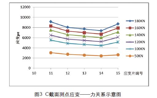 如上圖4、圖6所示: 1號、5號應變片、11號、15號應變片 應力比中部應力大,這表明錨固端對錨固區有一定的影響,當力 達到180KN時,兩端的應力比中部的應力明顯大一些。也表明力 越大,端部影響就越大。這也近一步說明在錨具張拉出口端附近 CFRP板的應力分布較為復雜,應力分布并不像遠離邊界部位的 應力那樣分布均勻。圖5所示,該截面上應力分布較均勻,應變差 基本可忽略不計,表明中心截面受碳纖維邊緣和錨具端附近影響 較小,能充分發揮出中部碳密度板的性能。