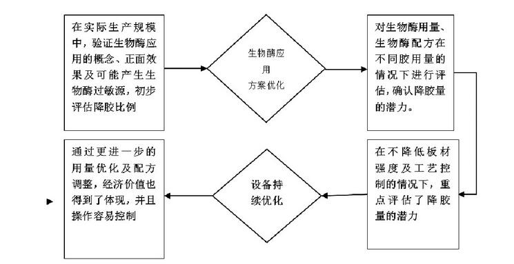 在實際生產規模中, 驗證生物酶應用的概念、正面效果及可能產生的生物酶過敏源, 對生物酶用量、生物酶配方在不同膠用量的情況下進行評估, 確認降膠量的潛力。在不降低板材強度及工藝控制的情況下, 重點評估了降膠量的潛力, 通過更進一步的用量優化及配方調整, 經濟價值也得到了體現, 并且操作容易控制, 生物酶應用方案與設備持續優化, 如圖1。